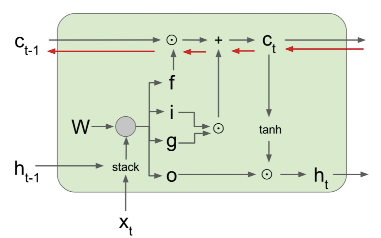 + forward시에 cell state 계산할 때 W도 관여를 했으므로 back prop 시에도 W가 고려가 된다.