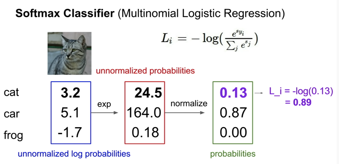 하지만 softmax classifier에서는 점수에 대한 해석을 할 수 있다.