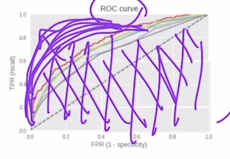 ROC 곡선이 가운데 직선에 가까워질수록 성능이 떨어지는 것