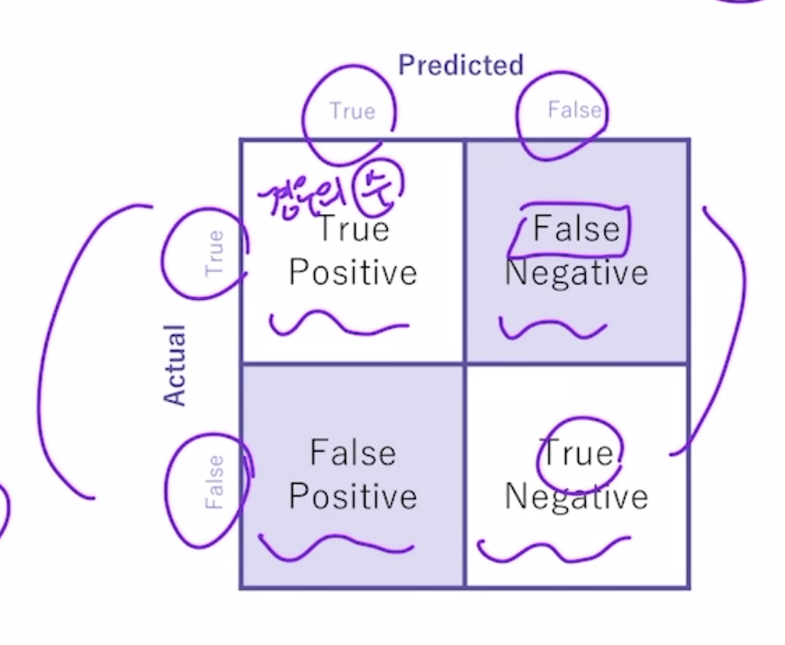 - 정확도 = 예측 결과와 실제 값이 동일한 건수 / 전체 데이터 수 (TN + TP) / (TN + FP + FN + TP)