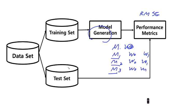 - test, train 데이터를 나눠서 모델을 생성하고 테스트하는 기법