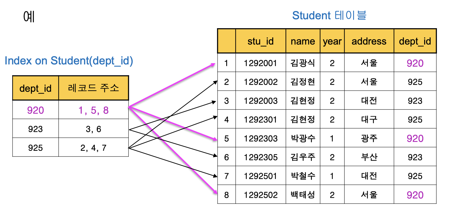 - student 테이블에 dept_id 필드에 대한 인덱스가 구축되어 있다면,
