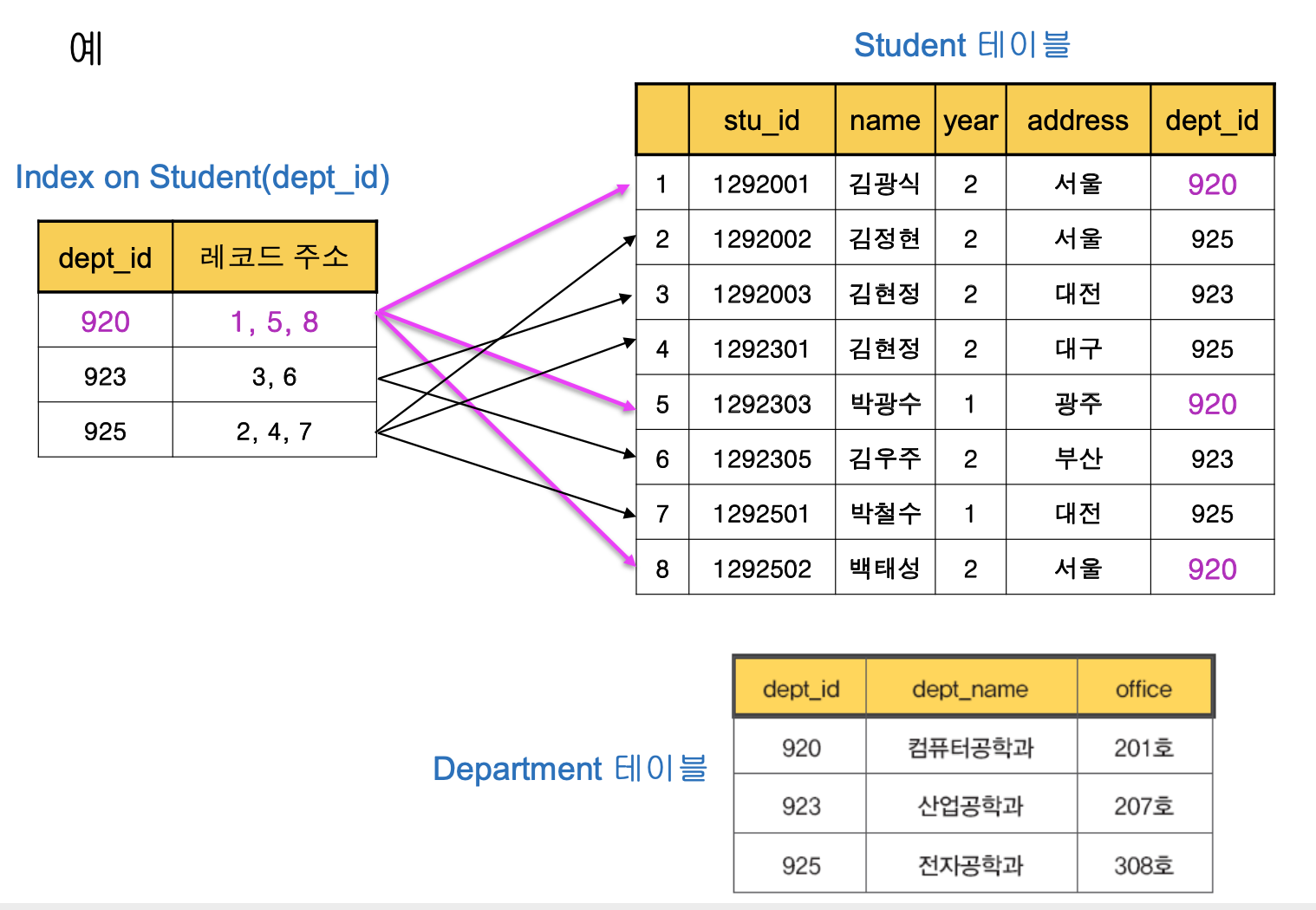 - student 테이블에 dept_id 필드에 대한 인덱스가 있을 경우,