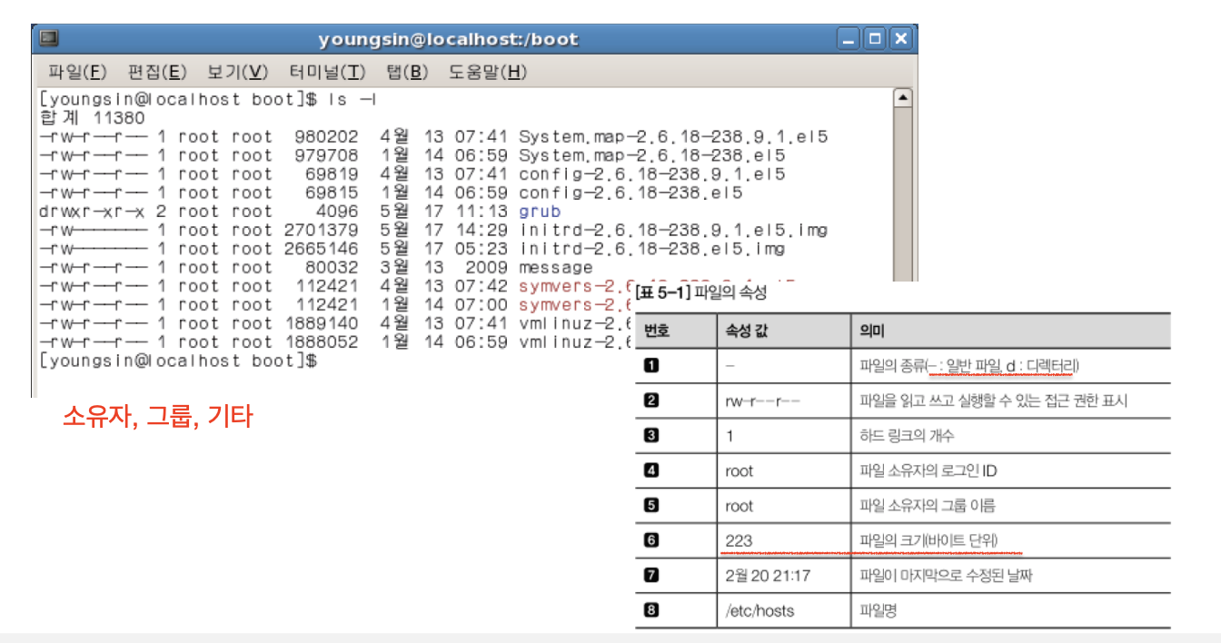 - 보호, 소유자, 생성시간, 수정 및 접근 시간 등