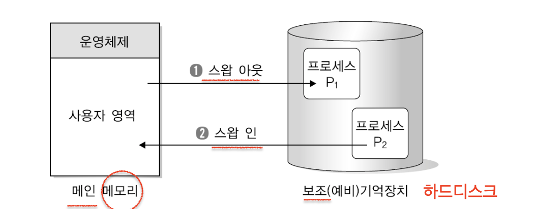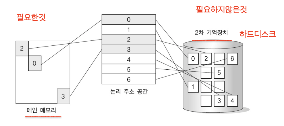 : 프로세스가 페이지나 세그먼테이션 등의 단위로 보조기억장치에 적재되어 있다가, 프로세스의 요구에 의해 메모리의 여러 영역에 할당된다.