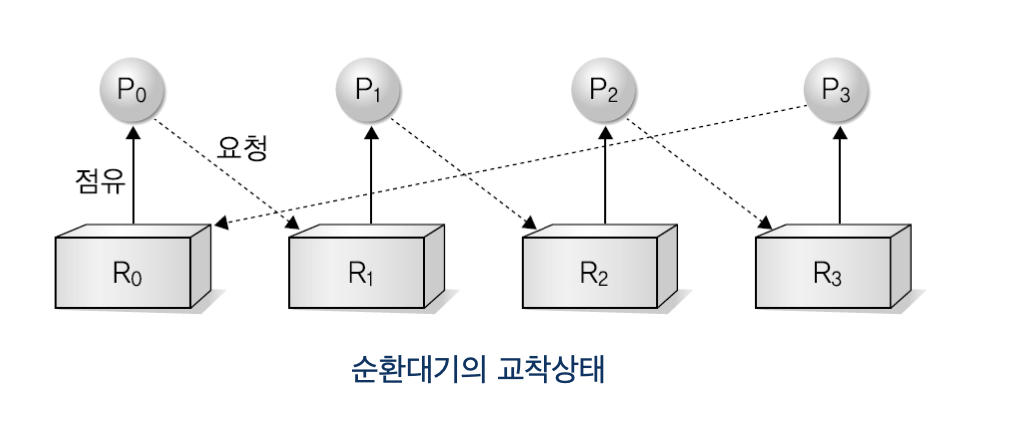 4) 순환대기(환형대기) : 교착상태를 따라가면 원이 만들어진다.