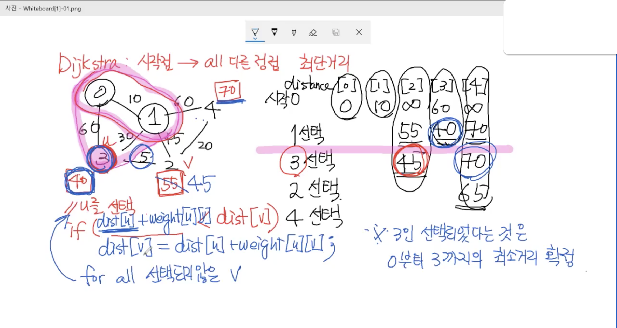 (w까지의 총 거리)를 (u까지의 거리와 u에서 w까지의 거리를 더한 것)으로 변경한다.