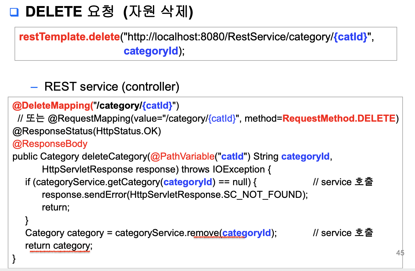 위와 같은 방식은 REST를 제대로 적용하지 않은 URI입니다. URI는 자원을 표현하는데 중점을 두어야 합니다. delete와 같은 행위에 대한 표현이 들어가서는 안됩니다.
