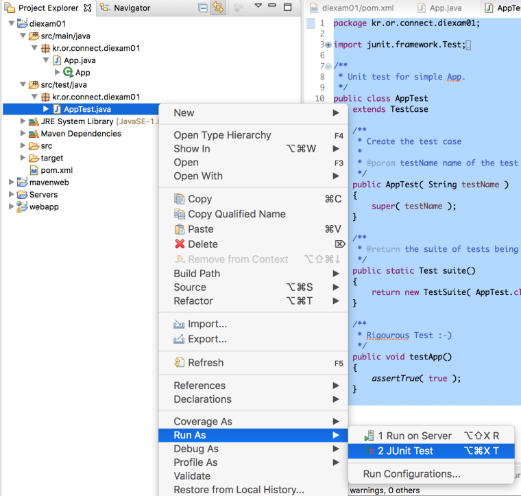 AppTest.java 를 선택한 후 우측버튼을 클릭하고 Run As -> JUnit Test 메뉴를 선택합니다.