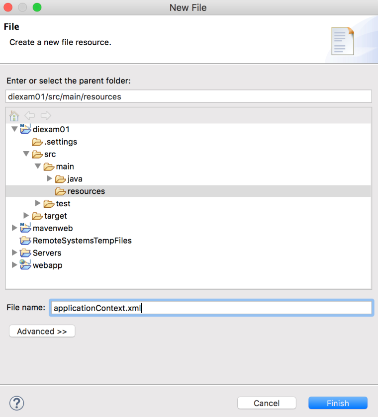 해당 폴더를 선택하고, 우측버튼을 클릭하여 New – File을 선택합니다. src/main/resources 폴더를 선택한 후 File name에 applicationContext.xml 을 입력하고 Finish버튼을 클릭합니다.