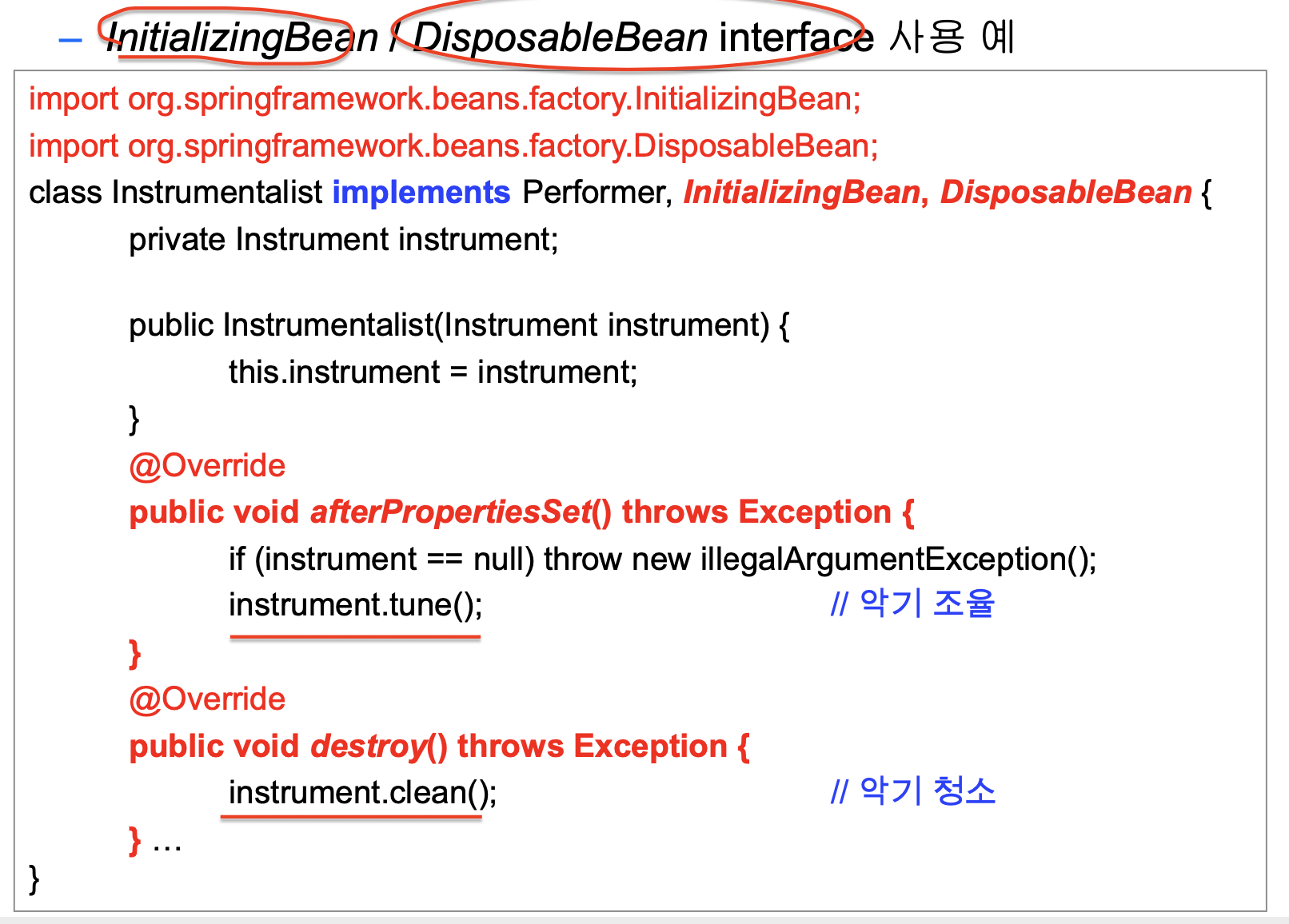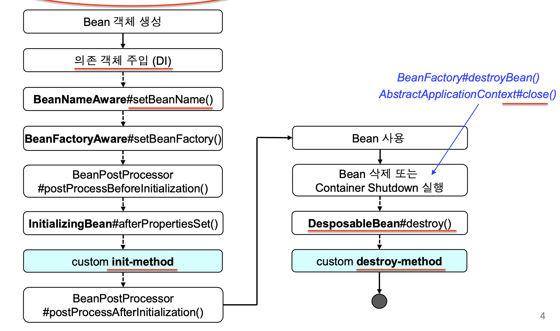 * bean 클래스에 life-cycle 관련된 callback method가 구현된 경우, container가 적절한 시점에 메소드를 호출함