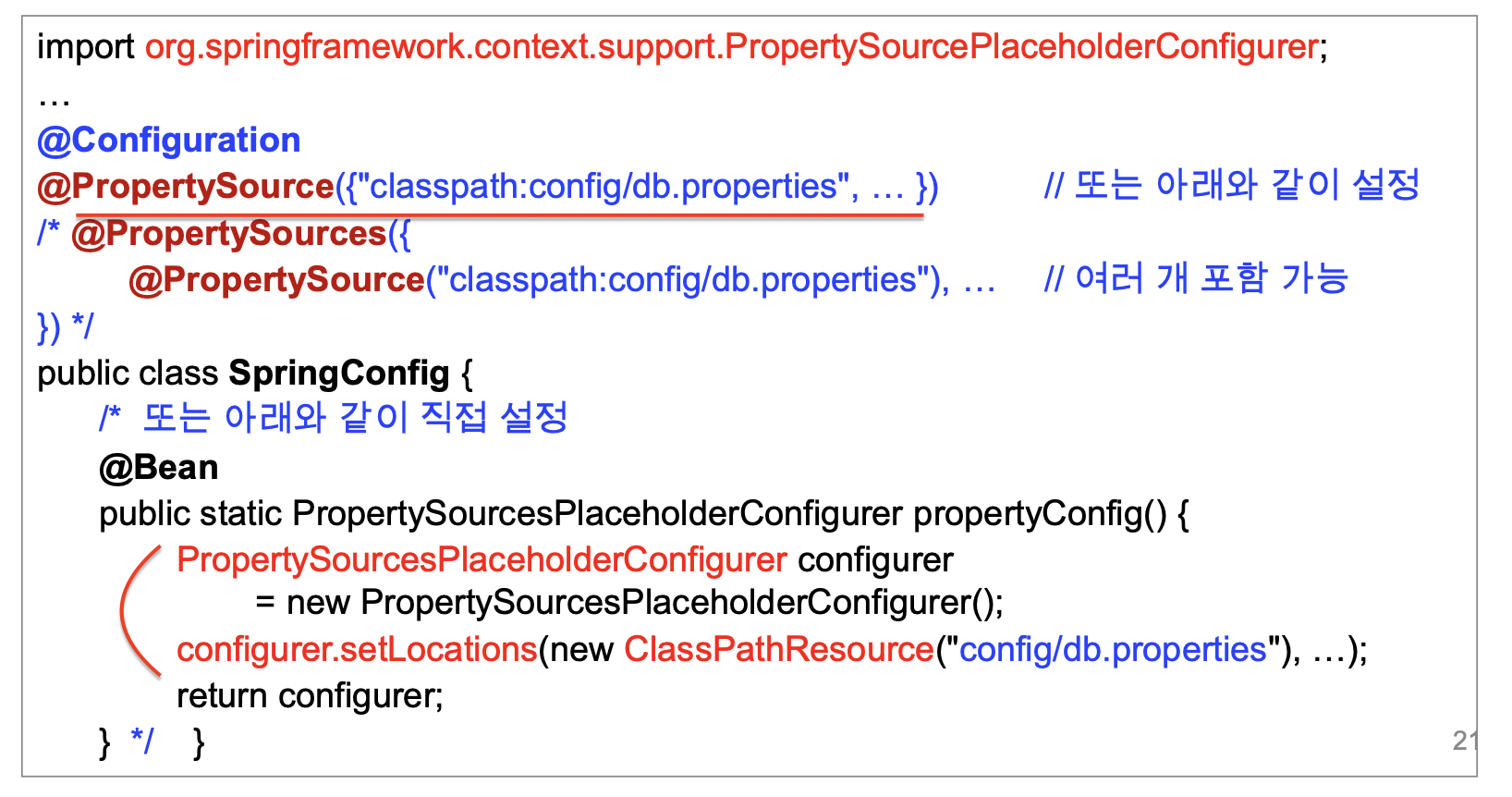 - PropertyPlaceholderConfigurer 타입의 객체를 bean으로 생성