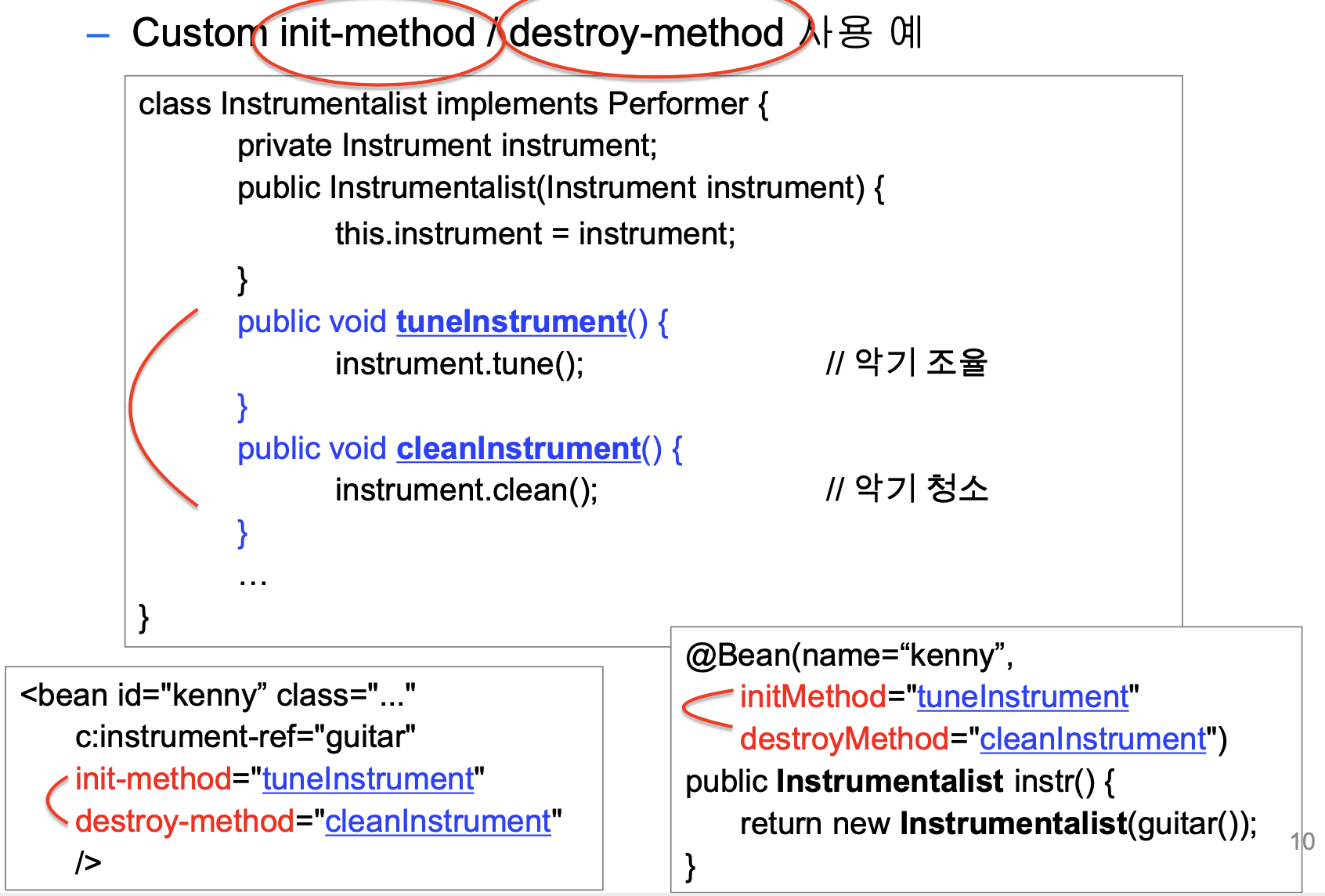 <bean>의 init-method, destroy-method 속성으로 지정된 메소드